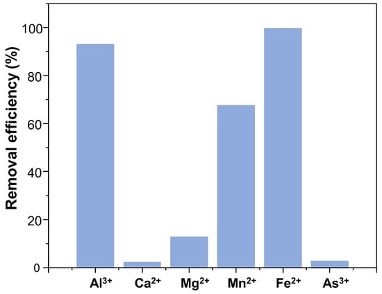 The removal efficiency of the beads was evaluated for the removal of Al3+, Fe2+, and Mn2+, with the solution containing 0.3, 0.65, and 0.25 mg L−1 concentrations, respectively. Around 65 mg of beads were weighed and put in contact with each solution for 1 h; then, the beads were separated, and the final concentration was measured via ICP-MS.