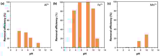 Removal efficiencies of TPB-DMTP-COF-SH towards (a) Al3+, (b) Fe2+, and (c) Mn2+ at different pH values.