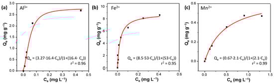 The adsorption results obtained fit the Langmuir model [30] (Figure 4 and Tables S6–S8), indicating a maximum adsorption capacity Qmax,Al = 3.27 mg g−1, Qmax,Fe = 8.5 mg g−1, and Qmax,Mn = 0.67 mg g−1. The Langmuir affinity (KL) constants were determined as KAl = 16 L mg−1, KFe = 53 L mg−1, and KMn = 2.1 L mg−1. These values highlight the strong affinity towards Al3+, Fe2+, and Mn2+ and reflect the extent of interaction between the adsorbate and the adsorption sites.