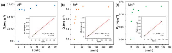 Adsorption kinetics of TPB-DMTP-COF-SH towards (a) Al3+, (b) Fe2+, and (c) Mn2+. Insets: fitting a pseudo-second-order linear model.