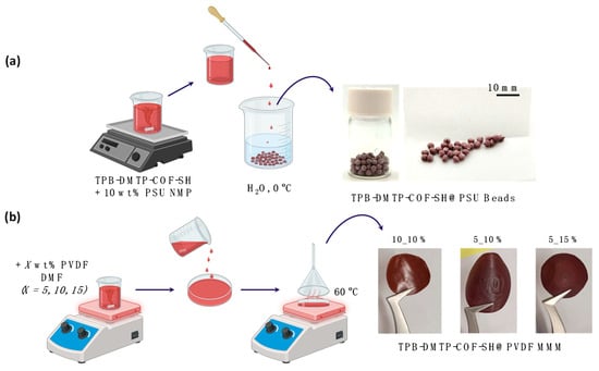 (a) Scheme of the procedure preparation of TPB-DMTP-COF-SH@PSU composite beads and (b) COF-based MMMs.