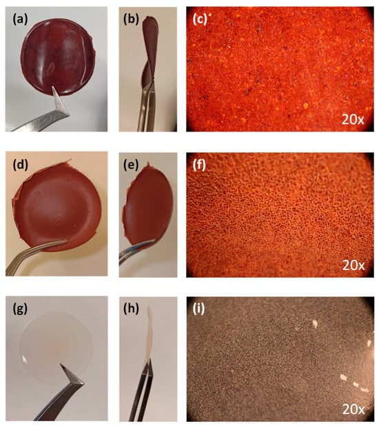 Photographs of the COF@PVDF MMMs: TPB-DMTP-COF-SH@PVDF 5_5% wt/wt (a) front view and (b) side view; TPB-DMTP-COF-SH@PVDF 10_5% wt/wt (d) front view and (e) side view; control PVDF (g) front view and (h) side view. Optical images of (c,f) the COF membranes and (i) the PVDF polymer.