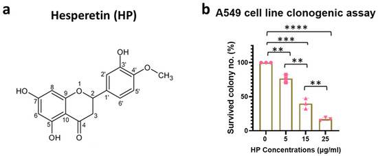 Antitumorigenic effect of Hesperetin in human lung cancer cell line. (a) Biochemical structure of Hesperetin. (b) Bar graph showing percent colony count for the clonogenic survival assay (n = 3) in human lung cancer cell line, A549, treated with Hesperetin (Sigma) doses from 5 to 25 µg/mL for 24 h. Data represent the mean +/− standard deviation (SD) of three experiments. ** p < 0.01, *** p < 0.001, **** p < 0.0001 at 95% confidence interval. The symbol “n” is for the sample number.