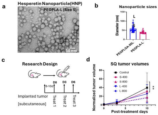 Preparation of Hesperetin-loaded nanoparticles (HNPs) and efficacy in a subcutaneous (SQ) mouse tumor model. (a) A transmission electron microscopy (TEM) image of HNPs (representative of size S) and (b) Bar graph of the different-sized (S and L representing 31–60 nm and 37–105 nm in diameter, respectively) HNPs used in the efficacy study in the SQ lung tumor model. (c) Study design and workflow for the in vivo study. (d) Tumor growth curve, depicting fold increase in tumor volume relative to tumor volume at day of treatment initiation. This is shown for different sizes and concentrations of HNP treatment in an SQ mouse model for mouse lung cancer showing up to 10 days while control mice were still alive. A single SQ cancer was implanted in one of the flanks of C57BL/6 background immunocompetent mice with matched background mouse LL/2-Luc2 cell line, and all cohorts (n = 5) were treated when the tumor reached palpable size. Each HNP size was injected intratumorally for treatment, separately for lower and higher doses. Control mice were treated with the same vehicle volume (100 µL). Data represent the mean +/− SD. ** p < 0.01 at 95% confidence interval.