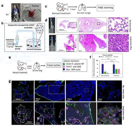 To further evaluate the in vivo action of HNPs in murine lung cancer, we generated a lung orthotopic mouse cancer model and followed the growth with BLI imaging (Figure 3a). We used intubation to implant the luciferase reporter-labeled cells LL/2-Luc2LLC-1 on the same C57BL/6 mouse background lung cancer cell line to generate orthotopic lung cancer, with one tumor per mouse (Supplementary Figure S2A,B). We then employed an aerosol drug delivery system using a nebulizer (Figure 3b and Figure S3) to establish an inhalation drug delivery system for lung cancer treatment. Using this aerosol inhalation system, we initially employed green fluorescence polymer nanoparticles (NPs) to confirm the uptake of NPs by lung tissue when using the aerosol drug delivery system. In addition, we used red cherry fluorescence-tagged anti-CD40 for the inhalation treatment along with the green fluorescence polymer NPs. To observe the uptake in tumor-inoculated lungs, we used lung orthotopic tumor-inoculated mice and healthy mice (Figure 3c). The tumor formation was initially observed via BLI imaging and later confirmed by ex vivo H&E images of the resected lungs (Figure 3d). Two weeks after the tumor inoculation, both groups of mice were given aerosol delivery of green fluorescence-tagged polymer NPs and red fluorescence-tagged anti-CD40 for 30 min simultaneously. Ex vivo resection of the lung’s frozen section (Figure 3e) within an hour following the treatment demonstrated preferential uptake of both HNPs (p < 0.01) and anti-CD40 (p < 0.001) (Figure 3f,g) by a graph and corresponding images of lung tumor tissues (lower panels) as compared to healthy lung tissues (upper panels).