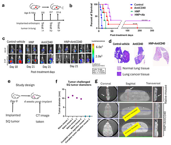 Efficacy of HNPs and anti-CD40 in lung cancer orthotopic animal model with aerosol drug delivery. (a) A schematic diagram of the aerosol drug delivery in orthotopic lung cancer bearing mice. (b) Kaplan–Meier survival graph showing the survival percent and duration of different cohorts of treated mice with aerosol delivery of anti-CD40 (n = 6), HNPs alone (n = 3), HNPs + anti-CD40 (n = 9), and control (n = 8). (c) Representative BLI images of the different cohorts from the treated mice with controls. The upper panel represents day 0 of the treatment, and the lower panel represents the post-treatment time for different cohorts: control (day 10), anti-CD40 (day 21), HNPs (Day 21), and HNPs + anti-CD40 (day 21). (d) Representative H&E images from the ex vivo lungs confirm some of the corresponding treatment outcomes. (e) Study design. (f) The graph shows the outcome of the tumor-rechallenged study with an SQ implant of LL/2-Luc2 tumor cells of the HNP- + anti-CD40-treated tumor-recovered mice (n = 2) with a cohort of naive mice as control (n = 4). (g) CT images were taken four weeks post-injection of tumor cells, confirming the outcome with tumor growth in naive and HNP + anti-CD40-treated mice with complete tumor regression. For statistical significance at a 95% confidence interval *** p < 0.001, **** p < 0.0001.