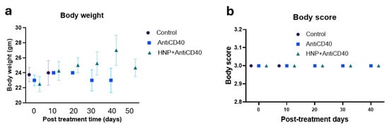 Toxicity study. (a) Body weight and (b) body scores were measured during the treatment period of the tumor-bearing mice for all cohorts of the aerosol-treated mice along with the controls. Each data represents the average outcome of the cohort for that time. (c) Three hours (n = 5) and (d) three days (n = 4) post-treated liver and kidney function clinical reports of the combination-treated (HNPs + anti-CD40) mice with aerosol-treated doses in wild naive (non-tumor bearing) mice. Ex vivo serum was collected for clinical laboratory reports for analysis of serum alkaline transaminase (ALT, normal range 15–80.1 U/L), serum aspartate transaminase (AST, normal range 33.95–268.47 U/L), serum bilirubin (normal range 0.17–0.53 mg/dL), and serum creatinine (normal range 0.12–0.43 mg/dL). Each piece of data represents an individual mouse. Red font arrows indicate the mouse’s upper and lower range of normal serum levels.