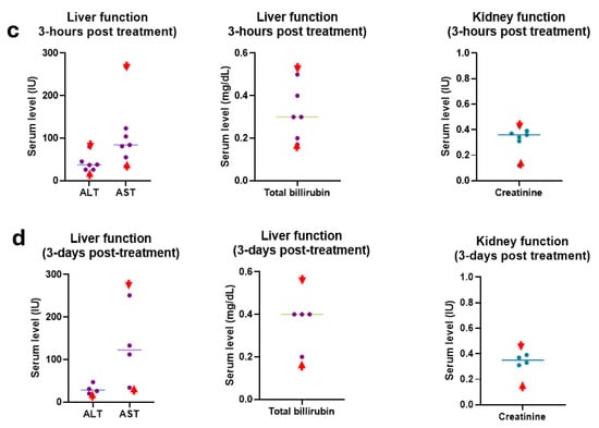 The toxicity study demonstrates no change in body score and body weight in the treatment cohorts (Figure 5a,b) of the tumor-bearing mice, and no significant deviation was found in the liver and kidney treatment for the aerosol HNP treatment when checking after three hours (Figure 5c) and three days post-treatment (Figure 5d) in the non-tumor-bearing mice.