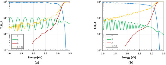 Optical transmittance (T), reflectance (R), and absorptance (A) spectra of selected thin films: (a) 1068 nm thick #3; (b) 2254 nm thick #4. For comparison, the 1-T-R spectra have been added.