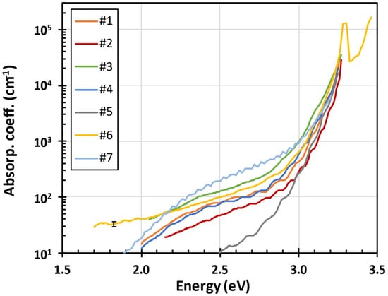 The optical absorption coefficient spectra of the ZnO layers listed in Table 1. The optical absorption coefficient below 10 cm−1 was too low to evaluate. Ab error bar is indicated on yellow curve at 1.8 eV.