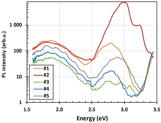The PL spectra of the ZnO layers #1–#5 measured at low temperature are shown in Figure 3. It should be noted that only sample #2 showed the measurable room temperature PL that was about two orders of magnitude weaker than PL at low temperature. No green PL was observed in any sample. Instead, the PL spectrum was dominated by red and blue bands, giving the PL a magenta appearance. All samples show similar broad band red PL band with the maximum at about 1.8 eV (690 nm). In our previous study we have shown that annealing in air at 350 °C resulted in the suppression of red PL, whereas the exciton band became improved. Further increase in the annealing temperature to 700 °C had opposite effect—the exciton band was strongly suppressed whereas the red band intensity increased and was redshifted from about 620 to 680 nm. Red bands we attributed in our previous paper to neutrally charged zinc vacancies (VZn0) unperturbed and perturbed by some defect nearby [40].