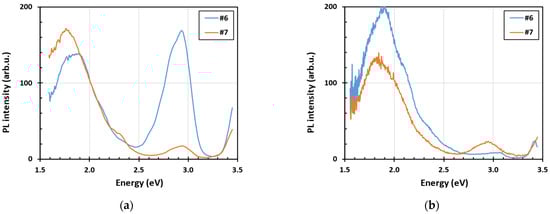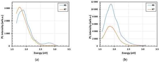 Stead-state PL spectra measured at low temperature (nominally 4 K) under the excitation wavelength 385 nm before (a) and after (b) 15 min annealing in air at 500 °C of two selected thin films: 1320 nm thick sample #6 and 4700 nm thick sample #7.