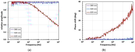 where ∆φ is the phase delay between the excitation and emission at the frequency f (in Hz). Since the phase resolution in our setup was about 0.2°, Equation (2) implies the time resolution of about 1 ns at 1 MHz frequency. Figure 6 shows that there is no detectable decrease in the relative amplitude and no detectable phase shift between UV excitation and UV or violet emission up to 1 MHz. The excitation and emission phase shift 10° (30°) at 10 kHz (1 MHz) implies the meantime decay of red PL emission to be about 3 µs (0.1 µs). Thus, the PL decay is not mono exponential and Equation (2) gives only a mean time of PL decay which depends on frequency and the frequency resolved phase shift between the excitation and emission needs to be measured [42].