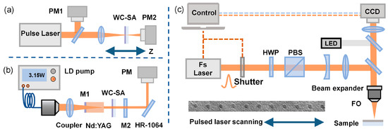 The laser-induced damage threshold is a critical parameter for evaluating the performance of SA optical modulators [17]. To accurately gauge the laser damage resistance of WC films, a specialized and precise testing system was constructed, with its layout elaborated in Figure 1c. The system consists of a stable laser source and a precision translation stage. The ultrafast laser system operates with a pulse duration of 1.2 ps and a repetition rate of 100 kHz at a wavelength of 1030 nm. By focusing the laser through a lens, a precise spot with a diameter of about 13.4 μm was formed on the WC film SA and each energy level corresponded to a row position on the sample. Further observation of the SA device using a white light interferometer allowed us to accurately capture the contour of the damaged area. As the laser energy density was gradually reduced, the damage to the SA device also decreased. Upon reaching a certain critical laser energy density, the damage to the WC film SA ceased to be observable, which allowed for the determination of the laser damage threshold range for the WC film SA [18].