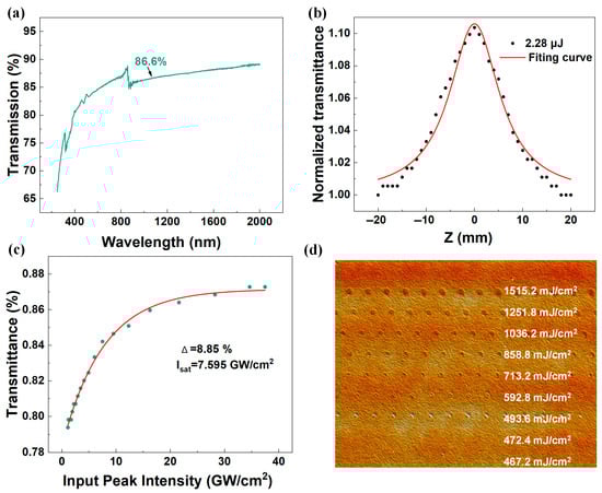 (a) Transmission spectra, (b) Z-scan, (c) relationship between normalized transmittance and input laser intensity, and (d) damage under different energy density conditions.