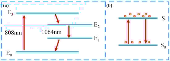 The saturable absorber can be considered a two-level system, as shown in Figure 4b. When pumping is initiated, the saturable absorber strongly absorbs 1 μm photons and leads to strong intracavity losses. As the number of particles that transition to the excited state S1 energy level increases, the number of particles in the ground state S0 gradually decreases, and the absorption of 1 μm by the saturated absorber gradually weakens. Until the ground state particles of the saturated absorber are exhausted, the Q value of the laser resonant cavity reaches its maximum and emits laser light in the form of pulses. After laser emitting, the intracavity loss is once again greater than the gain, and the resonant cavity returns to the photon accumulation phase and repeats the cycle of the process.