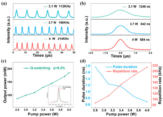 Q-switched operation: (a) typical laser pulse trains, (b) typical laser single pulses (c) average output power of Q-switched and emission spectrum, and (d) evolution of the repetition rate and pulse duration at the pump power.