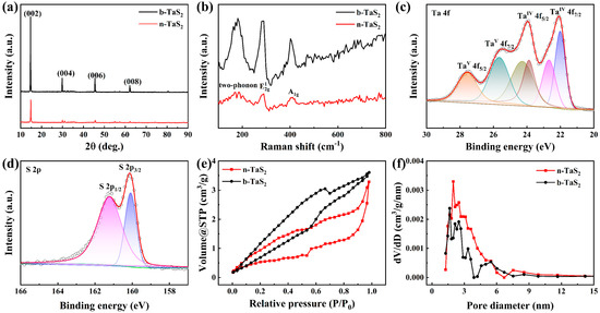 (a) XRD patterns and (b) Raman spectra of the b-TaS2 and n-TaS2 samples. High-resolution (c) Ta 4f XPS spectrum and (d) S 2p XPS spectrum of the n-TaS2 sample. (e) Isotherm N2 adsorption–desorption curves and (f) pore diameter distributions of the b-TaS2 and n-TaS2 samples.