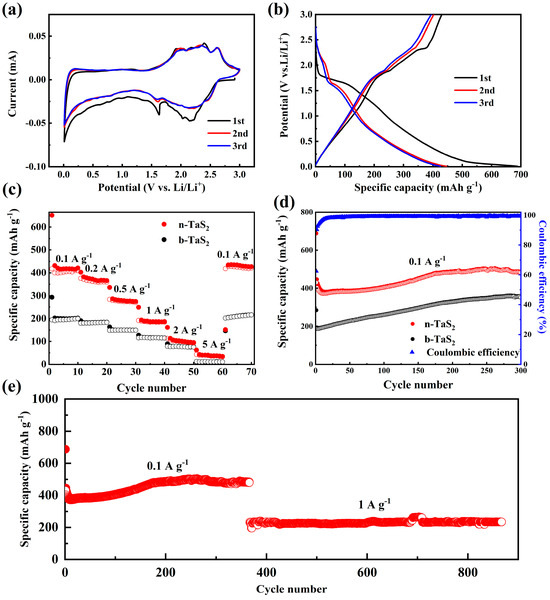 The electrochemical performance of b-TaS2 and n-TaS2 as the anodes for LIBs have been evaluated via assembling CR2032 coin half-cells with lithium foil as the counter electrode. The initial three cyclic voltammetry (CV) curves at a scanning rate of 0.1 mV s−1 in the voltage range from 0.01 to 3 V (vs. Li/Li+) for the b-TaS2 and n-TaS2 electrodes are shown in Figure 3a and Figure S4, respectively. For the b-TaS2 electrode, the reduction peak at about 1.61 V could be assigned to the Li+ insertion into the interlayer of the b-TaS2 electrode, forming LixTaS2. In the subsequent cycles, two oxidation peaks at about 1.90 and 2.34 V can be observed, which could be assigned to the gradual de-insertion process of Li+ in the TaS2 matrix. For the n-TaS2 electrode, there are the two reduction peaks at about 2.16 and 1.63 V, as shown in Figure 3a, which could be attributed to the gradual Li+ insertion into the interlayer of the n-TaS2 electrode. In the subsequent scanning of the n-TaS2 electrode, two oxidation peaks at about 1.96 and 2.37 V could correspond to the gradual de-insertion process, like that observed for the b-TaS2 electrode, and an additional peak at about 2.61 V could result from the deep de-lithiation process accompanied with the complex phase transformation, which will be further clarified via the ex situ measurements, as is discussed below. In the subsequent scanning, the redox peaks of the n-TaS2 electrode well overlap, indicating excellent electrochemical reversibility. The first three cycles of the galvanostatic charge/discharge (GCD) profiles of the n-TaS2 and b-TaS2 electrodes at 0.1 A g−1 are shown in Figure 3b and Figure S5, respectively. The n-TaS2 electrode delivered initial discharge and charge capacities of 688.5 and 430.1 mAh g−1, which are greatly higher than that of the b-TaS2 electrode (293.1 and 194.3 mAh g−1). The well-overlapped GCD profiles in the subsequent cycles for both of the electrodes suggest the strong cycling reversibility. Figure 3c shows the rate capability comparison of both electrodes. The n-TaS2 electrode delivered the higher capacities of 418.1, 374.4, 280.7, 188.9, 103.7, and 40.2 mAh g−1 at current densities of 0.1, 0.2, 0.5, 1, 2, and 5 A g−1, respectively, which are greatly higher than those of the b-TaS2 electrode. When returned to 0.1 A g−1, the capacity of the n-TaS2 electrode increased to 425.2 mAh g−1, indicating the former electrochemical activation process. It can be observed that only the capacity of 11.1 mAh g−1 can be delivered at 5 A g−1 for the b-TaS2 electrode, suggesting the enhanced charge transfer ability of the n-TaS2 electrode, which could be related to the smaller nanosheet size after the ball-milling process. The cycling performance comparison of both electrodes is displayed in Figure 3d. Both electrodes exhibit a similar trend of a capacity increase, while the n-TaS2 electrode delivered the higher reversible capacity of 484.9 mAh g−1 compared to that of the b-TaS2 electrode (352.4 mAh g−1) after 300 cycles at 0.1 A g−1. The reason for the increasing capacity with the cycling could be attributed to the complex structural evolution during the insertion/de-insertion processes, as is discussed below. To further confirm the long-term cycling stability of the n-TaS2 electrode, Figure 3e shows the longer cycling performance at 0.1 and 1 A g−1. It can be found that the capacity remains stable, with about 484 mAh g−1 after 366 cycles, and maintains a nearly constant capacity of 234.6 mAh g−1 with a capacity retention of 101.1% after 866 cycles at 1 A g−1. To clarify the origin of the dynamics for the enhanced rate capability, we performed electrochemical impedance spectra (EIS) measurements on both electrodes, as shown in Figure S6. The result indicates that the n-TaS2 has a smaller charge transfer resistance (Rct) and larger linear slope than the b-TaS2, suggesting an enhanced charge transfer ability and promoted lithium ion diffusion kinetics.