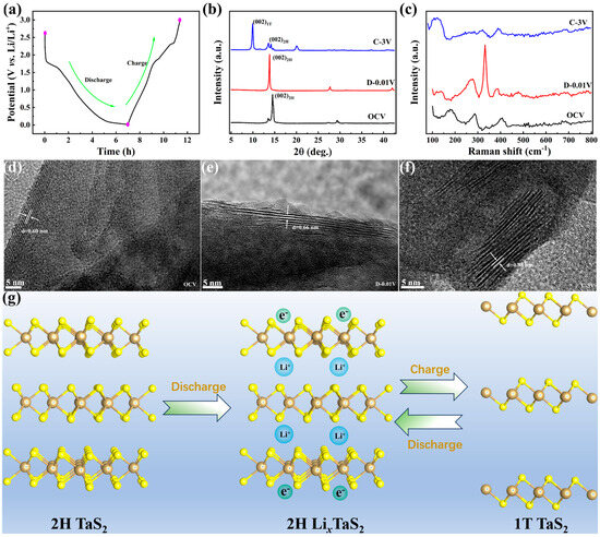 (a) The selected studied potentials at the first GCD curves, (b) ex situ XRD patterns, (c) ex situ Raman spectra, (d–f) ex situ HRTEM images, and (g) schematic diagram of the proposed reaction mechanism of the n-TaS2 electrode.