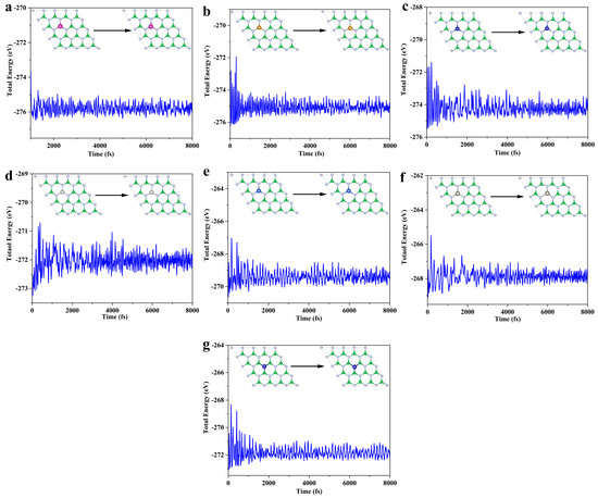 SACs AIMD: (a) Mn@B−1N; (b) Fe@B−1N; (c) Co@B−1N; (d) Ni@B−1N; (e) Cu@B−1N; (f) Zn@B−1N; (g) Co@BN−1.