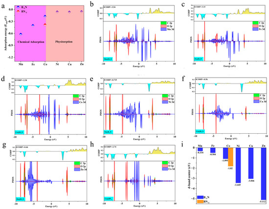 (a) Adsorption energies of CO2 on TM@B−1N and Co@BN−1 surfaces; (b–h) PDOS and the COHPs of CO2 on TM@B−1N and Co@BN−1 surfaces; the bonding and antibonding states in COHP are depicted by cyan and yellow, respectively. (i) The d-band center of TM@B−1N and Co@BN−1.