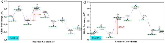 Gibbs free energy step diagram of single-atom catalyst CO2RR: (a) Mn@B−1N; (b) Fe@B−1N; (c) Co@B−1N; (d) Co@BN−1. The “*” in the figure indicates the catalyst.