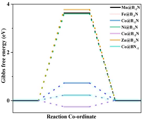 where (metal, bulk) represents the standard dissolution potential of the bulk metal, and ne denotes the number of electrons involved in the dissolution process. As illustrated in Figure 1e, when Ef < 0, the metal–support composite system exhibits lower energy than its separated components, indicating potential synthetic feasibility in experiments [47]. Moreover, a positive dissolution potential (Udiss > 0) suggests that the catalyst can resist metal dissolution under reductive conditions [48]. The computational results reveal that all TM@B−1N systems satisfy Ef < 0 and Udiss > 0, confirming both synthetic feasibility and electrochemical stability. The Co@BN−1 system meets the two stability criterion which are Ef < 0 and Udiss > 0. However, the Ni@BN−1 system fails to satisfy both structural stability conditions simultaneously, particularly due to Udiss < 0, which suggests a propensity for structural reconstruction during the catalytic process. Consequently, this system will not be taken into account in subsequent studies. Therefore, all TM@B−1N and Co@BN−1 systems demonstrate both thermodynamic and electrochemical stability, making them promising candidates for catalytic applications.