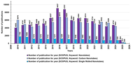 Many of the nanotube structures that have been extensively studied contain boron, silicon, and molybdenum atoms; carbon nanotubes (CNTs) are the most researched group among existing NT structures [14]. In fact, carbon nanomaterials (CNMs), including CNTs, graphene/graphene oxide (G/GO), and fullerenes, are allotropes of sp2 and sp3 hybridized carbon atoms and their sp2 and sp3 bonds and are thought to be responsible for their unique characteristics [12]. They have good interatomic interactions [14] and are very interesting nanostructures in terms of their special properties and possible applications [15]. CNTs are composed of graphite sheets rolled up in an unbreakable and non-stop hexagonal-like lattice structure, in which carbon atoms appear at the tops of the hexagon-type forms. Based on the number of carbon sheets, CNTs are categorized as single-wall carbon nanotubes (SWCNTs), double-wall carbon nanotubes (DWCNTs), and multi-wall carbon nanotubes (MWCNTs) [13]. Although MWCNTs have also been extensively studied for their demonstrated antimicrobial potential, SWCNTs have displayed excellent antibacterial action, according to some research, due to the smaller size of these materials, which play a significant part in the inhibition of microbes [12]. Through a search made on Scopus on 1 March 2025, using “nanotubes” as a keyword, for the last fifty years (2010–2025), we found 87,798 documents concerning “nanotubes” and 80,535 documents concerning “carbon nanotubes” (Figure 1). Through an additional survey and using the keywords “single-walled nanotubes”, we found 17,225 publications (Figure 1).