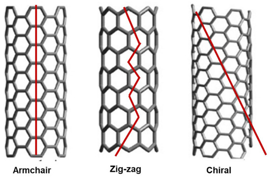 The study of CNT formations remains a cutting-edge field where new discoveries are being made regularly. Among the possible intimate structures that a SWCNT can assume, the armchair, zigzag, and chiral configurations are extensively recognized, based on the graphene mode to package into the CNTs cylinder (Figure 4).