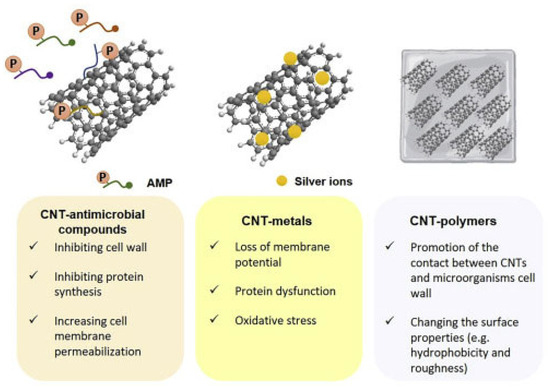 It has been reported that CNTs, especially SWCNTs and MWCNTs, possess excellent antibacterial and antifungal activity. Several mechanisms have been suggested to justify the CNTs’ toxicity against bacteria. Figure 5A shows the most recognized antimicrobial mechanisms [90].
