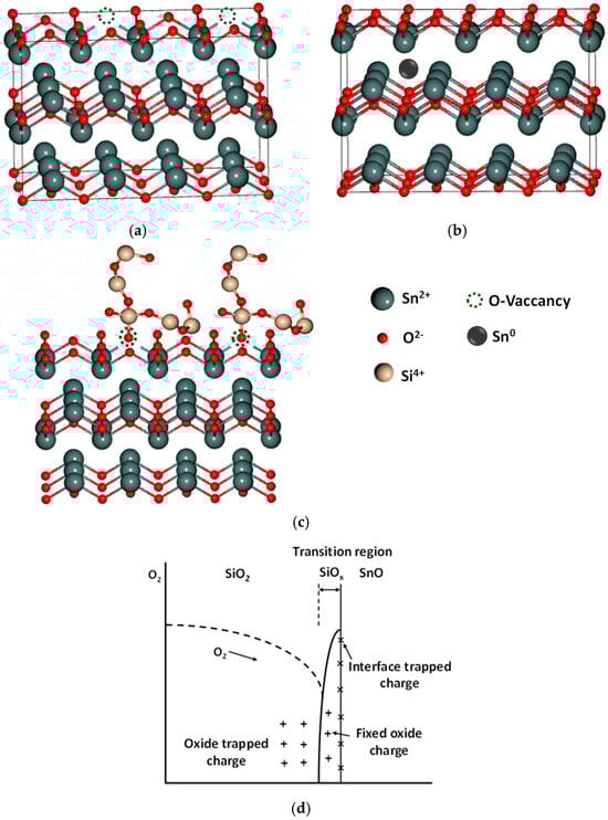 Figure 2a represents oxygen vacancy formation or the dangling bonds in the SnO structure during film processing caused by a low oxygen partial pressure while using a metallic Sn target. Moreover, insufficient oxygen during deposition or anneal can prevent the complete oxidation of Sn, leaving excess Sn atoms that may occupy interstitial sites, as shown in Figure 2b. Figure 2c,d show that with SiO2 passivation, the oxygen dangling bonds of SiO2 at the SnO/SiO2 interface could potentially interact with oxygen-deficient sites in SnO. In Figure 2d, a SiOx transition layer forms at the interface between SiO2 and SnO. This SiOx originates from the low-temperature-deposited SiO2 side, either due to oxygen diffusion or the partial reduction of SiO2 during processing. The interface contains various charges, as follows: oxide-trapped charges deep in SiO2, fixed-oxide charges near the interface, and interface-trapped charges at the SiOx/SnO boundary. These charges can affect device behavior by shifting the threshold voltage and degrading carrier mobility. Such dielectric and interface charges have been well studied in metal/SiO2/Si MOS capacitors, which cause Coulomb scattering and FET mobility degradation in 2D material FETs.