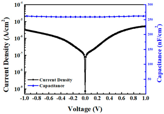 Figure 4 shows the capacitance density versus voltage (C-V) and current density versus voltage (J-V) characteristics of the Ni/6 nm SiO2/45 nm HfO2/TaN metal–insulator–metal (MIM) structure, which was made using the same mask as the SnO pFET. The capacitance density reaches 260 nF/cm2, which gives an overall high dielectric constant (high-κ) value of 15.0. The gate leakage current is only 4 × 10−6 A/cm2, attributed to the high-κ gate dielectric. The gate leakage current of metal-gate/high-κ/SnO is significantly higher than that in standard metal-gate/high-κ/single-crystal Si Complementary Metal–Oxide–Semiconductor (CMOS) FETs [20]. This is because the former is made at a limited temperature of 400 °C for backend-of-line (BEOL) processes while the latter is fabricated at 1000 °C. The limited thermal budget causes defects and trap-assisted leakage in the high-κ gate dielectric. To further decrease gate leakage current under low-temperature processing conditions, atomic layer deposition (ALD) can be employed; however, this involves a relatively long process time.