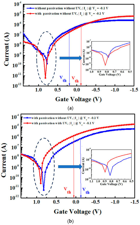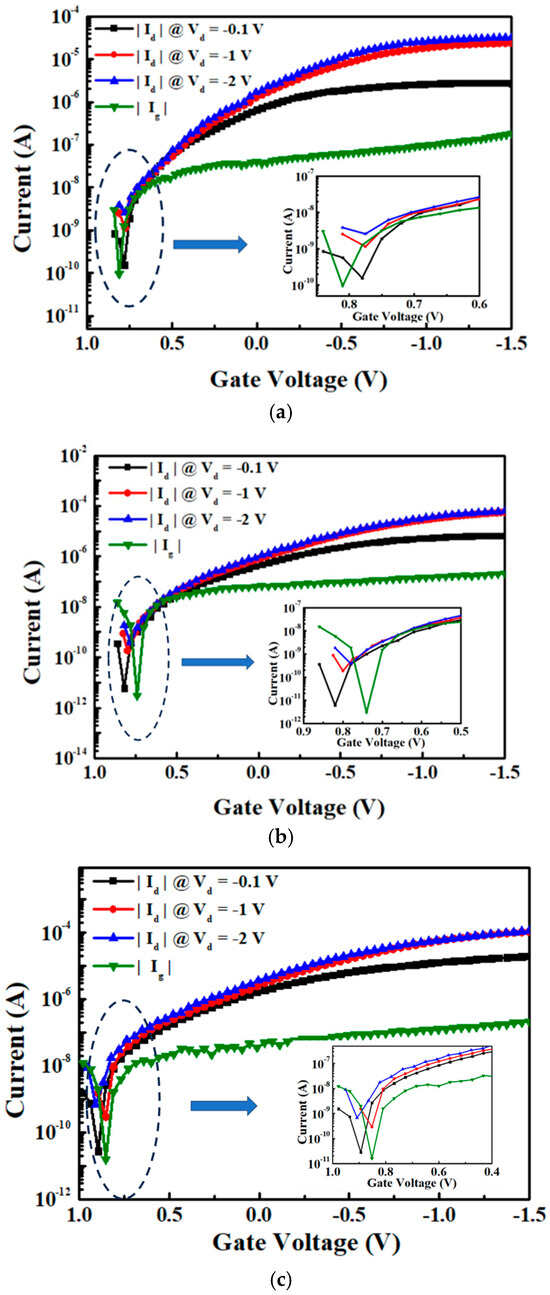 Figure 8a–c present the |Id| − Vg characteristics of the 7 nm thick SnO device with and without passivation and with and without UV anneal. At Vd = −0.1 V, the SnO pFET with a passivation layer and UV anneal shows the highest |Id|. Such a higher |Id| is important for a higher-speed IC device.