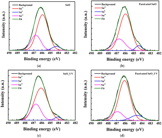 XPS Sn 3d5/2 peaks of SnO pFET (a) w/o passivation w/o UV, (b) w/o passivation w/o UV, (c) w/i passivation w/o UV, and (d) w/i passivation w/i UV.