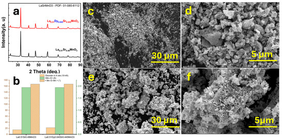 (a) X-ray diffraction (XRD) patterns of La0.51Sr0.49MnO3 and Dy-doped La0.51Dy0.045Sr0.445MnO3, showing phase identification using Cu Kα radiation (λ = 1.5406 Å). (b) Schematic representation illustrating changes in lattice disorder and Mn–O–Mn bond angles. (c–f) SEM images of the nanoparticle morphology taken at 15 kV, showing porosity and grain-size evolution with Dy doping.