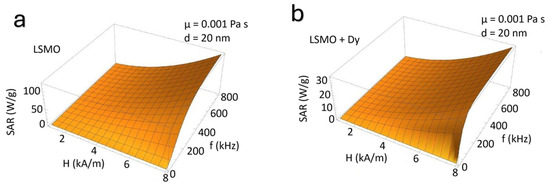 The non-monotonic dependence of the SAR on viscosity presented in Figure 5 describes the competition between Néel and Brownian relaxation mechanisms. The SAR is maximized when the effective relaxation time () resonates with the frequency of the applied magnetic field. At low viscosities, Brownian relaxation dominates but is too fast (the nanoparticle rotates easily) for efficient heating. In this case, the nanoparticle does not lose energy. This behaviour demonstrates the low values of the SAR. As viscosity increases, rotational motion slows, and the SAR increases. Further increases suppress the Brownian contribution, and the SAR decreases. This crossover point is frequency- and size-dependent. Dy doping increases magnetic anisotropy, slowing Néel relaxation and slightly shifting the crossover while reducing the overall SAR due to magnetic dilution. As a result, the SAR peak becomes sharper and occurs at slightly lower viscosities in Dy-LSMO compared to LSMO.