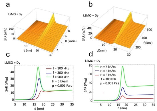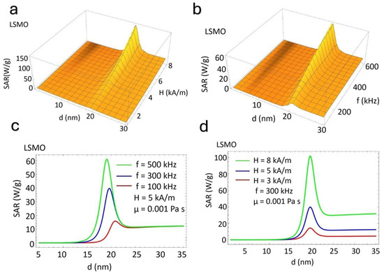 Figure 3a,c show that the SAR increases nonlinearly as H increases. There is a specific value of particle size for a fixed frequency where energy dissipation is most efficient. Also, the SAR increases significantly with the frequency. A resonant peak in the SAR appears around 18 nm (Figure 3b,d).