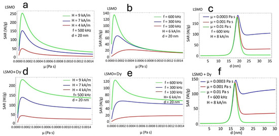 (a,b) SAR (W/g) of LSMO and (d,e) Dy-doped LSMO nanoparticles as a function of ferrofluid viscosity (μ, Pa·s). (c,f) SAR versus particle size (d, nm) and viscosity.