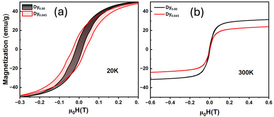 (a,b) Field-dependent magnetization at 20 K (a) and 300 K (b) for LSMO and Dy-doped LSMO nanoparticles.