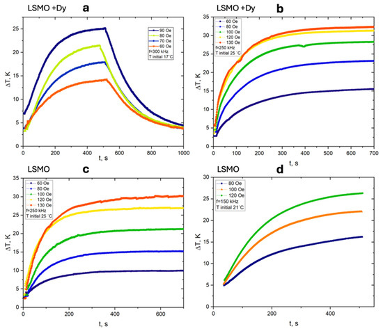 Hysteresis measurement data indicate the absence of hysteresis (Figure 6b), so our particles are superparamagnetic because they should not exhibit hysteresis, theoretically [47]. If we talk about domains, there are three different concepts: a single-domain state (no domain walls in the sample), homogeneous state (the direction of magnetization in the sample is the same at all points), or superparamagnetic state (the direction of the magnetic moment of the particle changes chaotically over time). The radius of the homogeneous state is smaller than the radius of the single-domain state. The radius of the superparamagnetic state is usually the smallest of all, so if we see superparamagnetic hysteresis, then there are good reasons to believe that the particle is in a single-domain state. Through the approximation of the SAR(H) by a power function, the exponent was found to be equal to a = 1.81 for Dy-doped LSMO nanoparticles at a frequency of 250 kHz, and for nanoparticles without the addition of dysprosium, the exponent was equal to a = 1.95, which confirms the superparamagnetic state of the nanoparticles because the exponent would be more than 3.0 in the event of hysteresis.