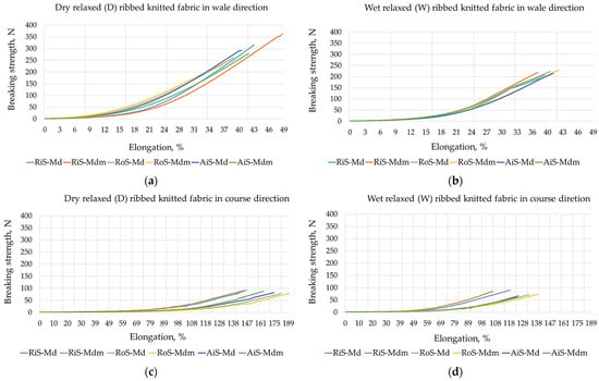 Strength/elongation diagrams for modal (Md) and modal-micro (Mdm) ribbed knitted fabrics fabricated from RiS (ring-spun), RoS (open-end rotor-spun) and AiS (air-jet-spun) yarns: (a) dry relaxed (D) in wale direction; (b) wet relaxed (W) in wale direction; (c) dry relaxed (D) in course direction; (d) wet relaxed (W) in course direction.