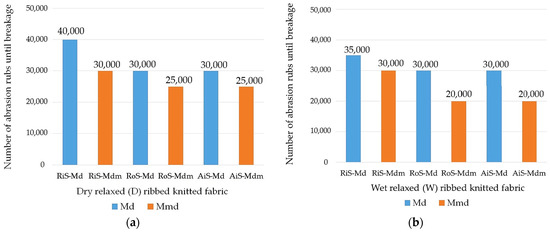 Number of abrasion rubs where breakage occurred in modal (Md) and modal-micro (Mdm) ribbed knitted fabrics fabricated from RiS (ring-spun), RoS (open-end rotor-spun) and AiS (air-jet-spun) yarns: (a) dry relaxed (D); (b) wet relaxed (W).