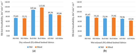 Breathability of ribbed knitted fabrics: (a) modal (Md) and modal-micro (Mdm) dry relaxed (D); (b) modal (Md) and modal-micro (Mdm) wet relaxed (W) ribbed knitted fabrics fabricated from RiS (ring-spun), RoS (open-end rotor-spun) and AiS (air-jet-spun) yarns.