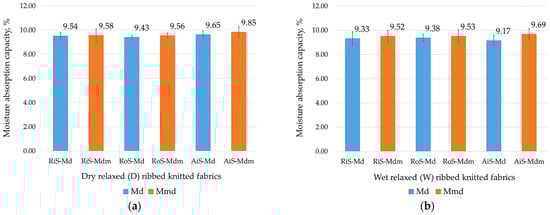 This can be seen from the results of the moisture absorption capacity of the dry and wet relaxed samples, which are shown in Figure 7. Higher moisture absorption was found for all knitted samples fabricated from microfibers (which is also consistent with data from the literature for single-jersey knitwear [1]). It should be noted that the moisture absorption capacity values of knitted fabrics fabricated from regular–fine modal fibers and microfibers are quite similar and that they decrease minimally after wet treatment as follows: for knitted fabrics fabricated from modal fibers, from −0.31% for RoS knitted fabric to −1.62% for AiS knitted fabric; and for knitted fabrics fabricated from modal microfibers, from −0.53% for RoS knitted fabric to −4.97% for AiS knitted fabric.