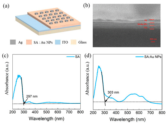 Ag/SA:Au NPs/ITO/glass device: (a) Schematic diagram of multi-layer structure of the device. (b) SEM images showing the thickness of each layer of the device. UV–visible absorption spectra of the dielectric films: (c) Pure SA film with absorption edge at 297 nm. (d) SA:Au NP composite film with red-shifted absorption edge at 303 nm, indicating bandgap narrowing induced by nanoparticle incorporation.