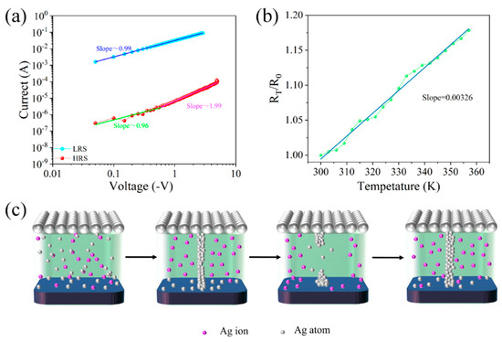 Ag/SA:Au NPs/ITO/glass device conductive mechanism: (a) I–V characteristic curve on the double logarithm axis. (b) Resistance with temperature test results. (c) Schematic diagram of the conductive mechanism of the device (silver conductive filament).