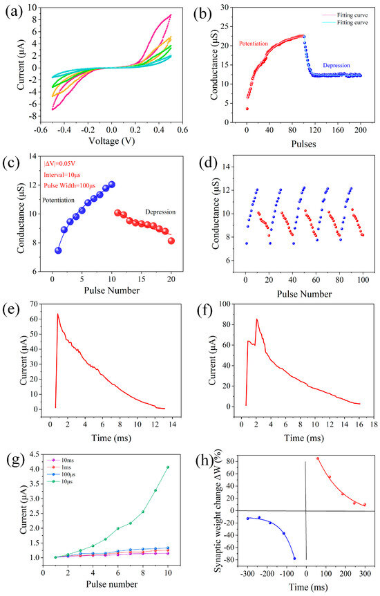 As one of the important characteristics of synaptic plasticity, spiking time-dependent plasticity (STDP) is defined as the relative change in synaptic weight (ΔW) caused by the excitation of the anterior and posterior synaptic membranes. The relative timing ∆t between pre- and post-synaptic pulses was varied from –100 ms to +100 ms in steps of 10 ms, and each data point was averaged over five repetitions. The test results are shown in Figure 4h, where the synaptic weight changes as