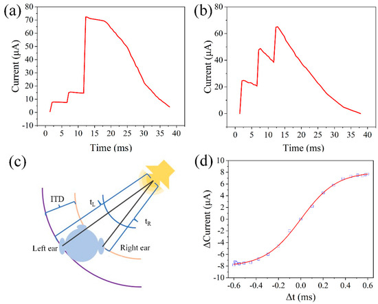 Hearing is one of the most important senses in the human body and plays an irreplaceable role in information acquisition and environmental adaptation [1]. In the human brain, the auditory system is an intricate, sophisticated, and efficient network [2]. Through our ears, sound signals are first captured and transmitted to the middle ear, and through the tympanic membrane, the auditory ossicles, sound is converted into nerve signals [3]. These nerve signals are then converted into electrical signals by auditory cells in the cochlea [4], which are then transmitted by the auditory nerve to the auditory cortex of the brain [5]. Neurons and synapses play a key role in this process, transmitting sound information to the brain for further processing [6]. Hearing is not only the simple perception of sound, but also involves the direction, distance, and speed of the sound source [7]. The accurate processing of this information allows us to sense where the sound is coming from and to react quickly, such as determining the direction of the sound source or determining the urgency of the sound [8]. As one of the core functions of auditory cognition, sound localization depends on the precise decoding of temporal cues, particularly the interaural time difference (ITD), which is processed by neural circuits in the brainstem. At present, the implementation of the sound localization function is based on CMOS circuits, and the principle is to detect the binaural sound signal receiving time difference and then realize the sound location function [9,10,11]. Duy Nguyen et al. used a field-programmable gate array to achieve real-time sound localization with two microphones and successfully located the sound source in a noisy environment with a low signal-to-noise ratio of 10 dB [12]. Jungdong Jin et al. implemented real-time sound localization based on a 0.13 µm CMOS processor. The arrival delay method is used to obtain the direction of the sound signal, but the design of the chip has higher requirements for the experimental environment [13]. Despite the effectiveness of these conventional systems, they are limited by high power consumption, hardware complexity, and latency caused by the separation between memory and processing units. With the explosive growth of real-time sound information data and the separation of processing units and memory [14], considerable time and power consumption are wasted in the process of data transmission, which cannot meet the growing needs of people [15].