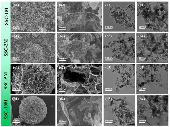 SEM images of (a1,a2) SSC-1M, (b1,b2) SSC-2M, (c1,c2) SSC-5M, and (d1,d2) SSC-10M, and TEM images of (a3,a4) SSC-1M, (b3,b4) SSC-2M, (c3,c4) SSC-5M, and (d3,d4) SSC-10M.